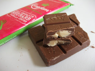 Biting into a piece I was first met with the thick milk chocolate - it tasted quite rich and with a good cocoa flavour. The rhubarb and vanilla centre was quite firm, perhaps due to containing white chocolate, but when eaten it melted in the mouth nicely. The rhubarb flavour was quite subtle and refreshing - I was surprised it didn't taste tart and tangy, but it's probably good it didn't as that would've ruined the flavour balance. I loved the subtle creaminess of the centre contrasted with the richer milk chocolate - the flavours worked really well together.