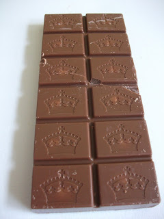 This bar is described as "Milk chocolate with a white chocolate rhubarb & vanilla centre", and contains 34% cocoa solids. Opening the wrapper I was very impressed by the thick, chunky feel of the blocks. Each one has the Kingdom crown logo imprinted on it: