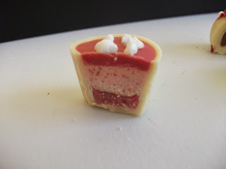 "Fabulously fruity cranberry ganache and strawberry mousse with meringue sprinkles" - This one was absolutely delicious...the sharpness of the cranberry was nicely balanced by the fruity strawberry mousse, whilst the white chocolate provided a creamy backdrop. The meringue pieces added a welcome crunch. Very yummy and a perfect Christmas-themed chocolate! 9 out of 10.